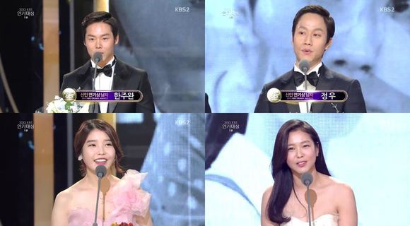 배우 정우, 한주완, 아이유, 경수진이 남녀신인연기상을 수상하는 영예를 안았다.