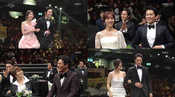 이날 1부의 마지막을 장식한 베스트커플상은 무려 5커플이 주인공이었다. '최고다 이순신' 조정석-아이유, '비밀' 지성-황정음을 비롯해 '직장의 신' 오지호-김혜수, '굿닥터' 주원-문채원, '총리와 나' 이범수-윤아 커플이 바로 그 주인공.