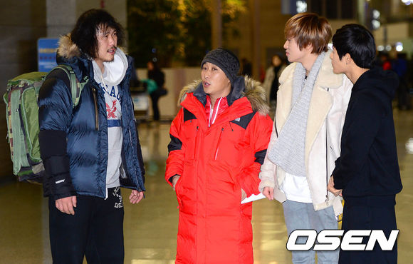 육중완, 김병만, 니엘, 김동준이 출국 전 이야기를 나누고 있다.