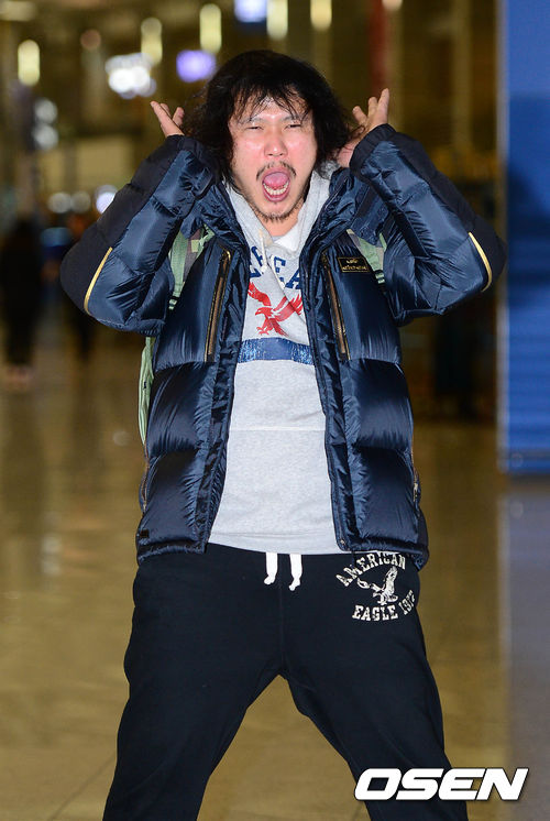 육중완이 취재진을 향해 포즈를 취하고 있다.