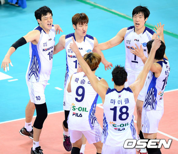 2세트 득점에 성공한 대한항공 선수들이 환호하고 있다.