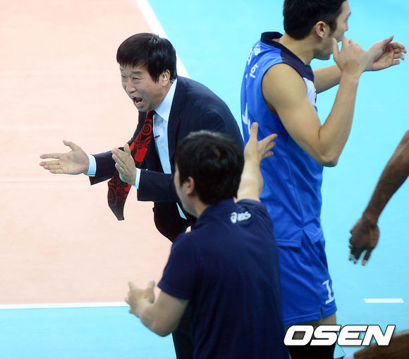 2세트를 극적으로 승리한 현대캐피탈 김호철 감독이 환호하고 있다.