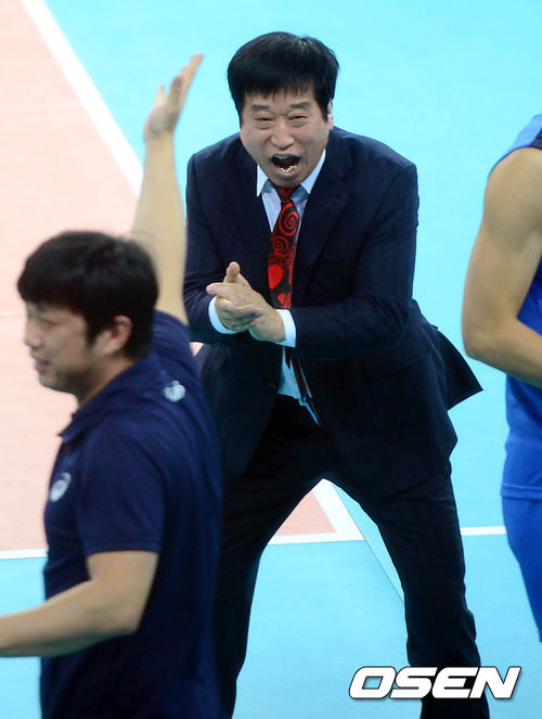 2세트를 극적으로 승리한 현대캐피탈 김호철 감독이 환호하고 있다.