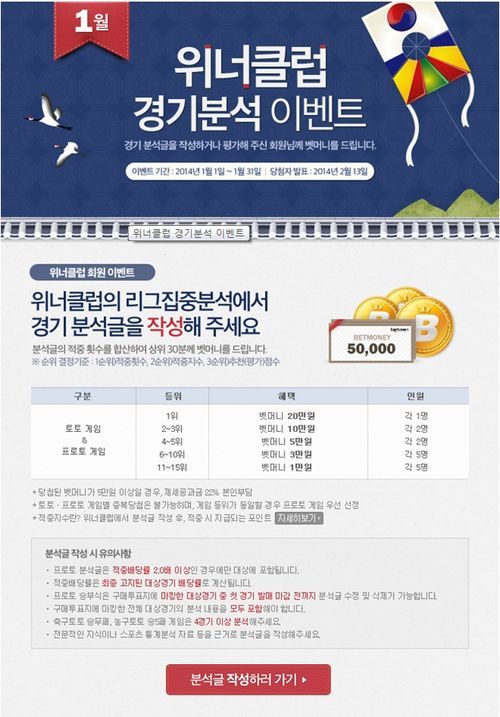 이번 이벤트는 위너클럽 회원 중 '리그집중분석'에서 토토 및 프로토 대상경기 적중 분석글을 작성한 회원 중 경기 분석글을 많이 작성한 회원 중 상위 30명에게 벳머니를 증정한다.