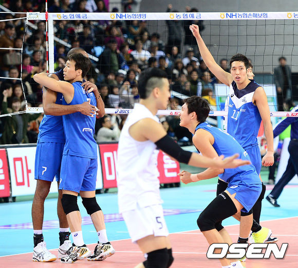 현대캐피탈은 1일 인천계양체육관에서 열린 '2013-2014 NH농협 V-리그' 남자부 대한항공과의 경기에서 5세트 접전 끝에 3-2(25-20, 23-25, 26-24, 16-25, 15-13)로 이겼다. 승점 2점을 보탠 현대캐피탈(승점 32점)은 선두 삼성화재(승점 33점)에 1점차로 다시 따라 붙었다. 반면 대한항공(승점 20점)은 4위 자리를 다시 찾는 데 만족해야 했다.