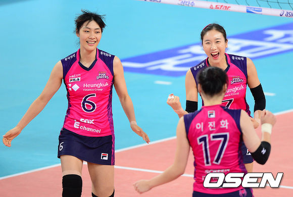 1세트 득점에 성공한 흥국생명이 환호하고 있다.