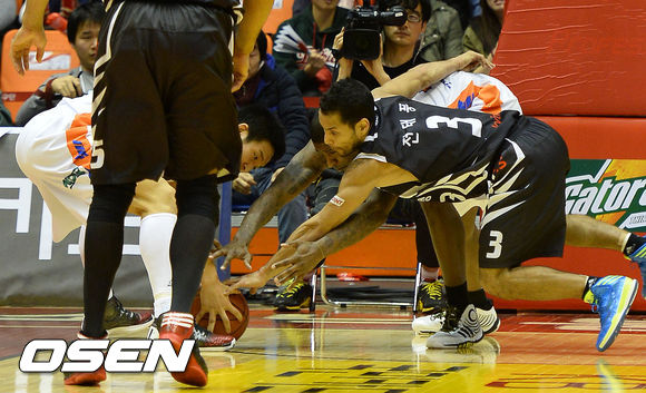 4쿼터,전자랜드 이현호와 포웰이 KT 전태풍과 루즈볼을 다투고 있다. /ouxou@osen.co.kr