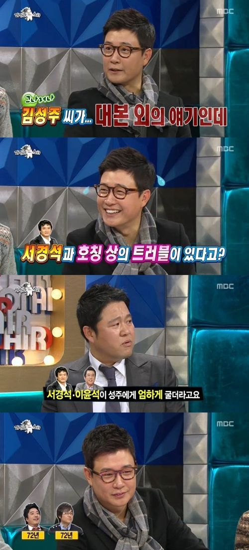 김성주는 1일 오후 11시 15분 방송된 MBC 예능프로그램 '황금어장 라디오스타'(이하 '라스')에서 서경석에게 "우리 이제 등본에 나와 있는대로 하자. 2014년부터는 친구 하자. 형을 싫어하는 건 아니다. 좋아한다"라고 장난스럽게 마음을 전해 웃음을 자아냈다.
