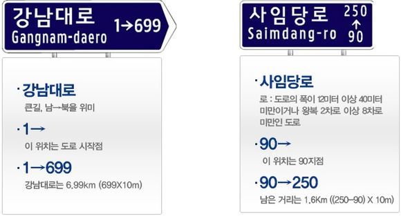 도로명주소에서 도로는 폭에 따라 '대로' '로' '길'로 구분한다. 대로는 폭 40m 이상 또는 8차로 이상 도로에, 로는 폭 12∼40m 또는 2∼7차로에, 길은 대로와 로 외의 도로에 붙인다.