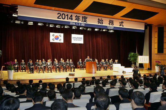현대차그룹은 2일 정몽구 회장 주재로 서울 양재동 본사에서 2014년 시무식을 갖고 올해 경영방침을 발표했다. 이 자리에서 정몽구 회장은 2014년 그룹 경영방침을 '역량 강화를 통한 미래성장 기반 강화'로 제시하고 미래를 향한 새로운 성장 동력 창출을 위해 전 임직원의 역량 결집을 당부했다.