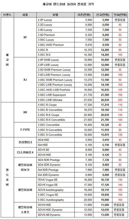 재규어의 베스트셀링 모델인 재규어 XF 2.2 디젤은 40만원 낮아진 6,050만 원, 랜드로버 대표차종 디스커버리4는 세부 모델에 따라 60~70만원 인하돼 8,000만 원과 9,120만 원으로 조정된다.