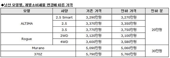 한국닛산㈜(대표: 타케히코 키쿠치)은 1월 1일부터 개별소비세율 변경에 따라 알티마, 로그, 무라노, 370Z 등 2,000cc 급 초과 차량에 대해 최소 20만원에서 최대 30만원까지 가격인하를 실시한다.