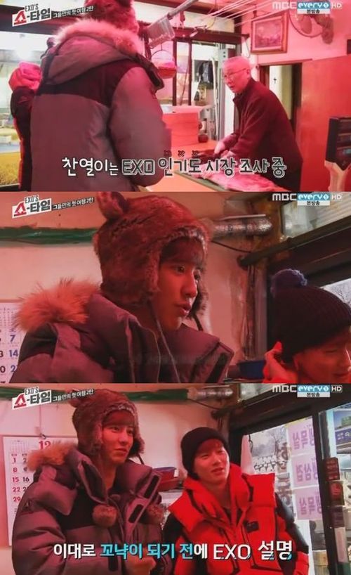 찬열과 수호는 2일 오후 방송된 MBC에브리원 예능프로그램 '엑소의 쇼타임'에서 강원도 속초시장에서 상인들을 상대로 인지도 조사를 벌였다.