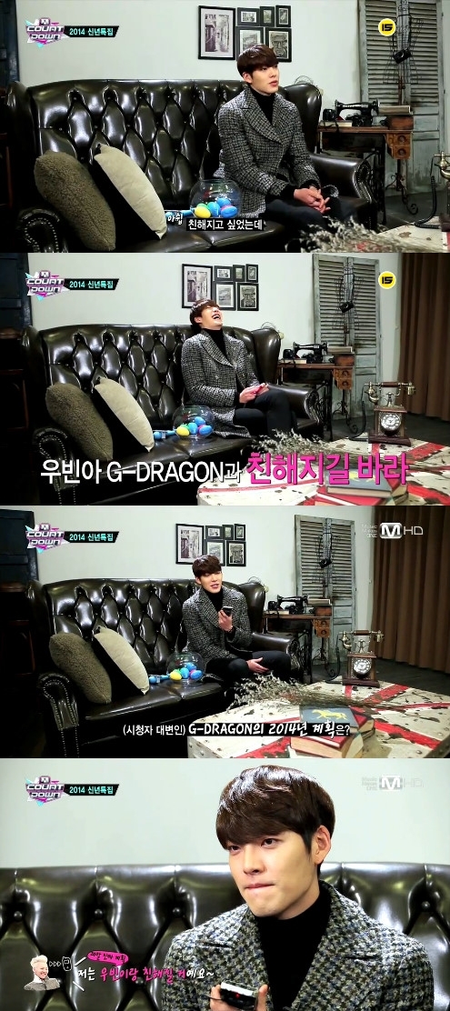 지드래곤은 2일 방송된 엠넷 '엠카운트다운' 2014 신년특집에서 김우빈과의 전화통화를 통해 2014년의 계획은 “김우빈과 친해지는 거다”라고 말했다.