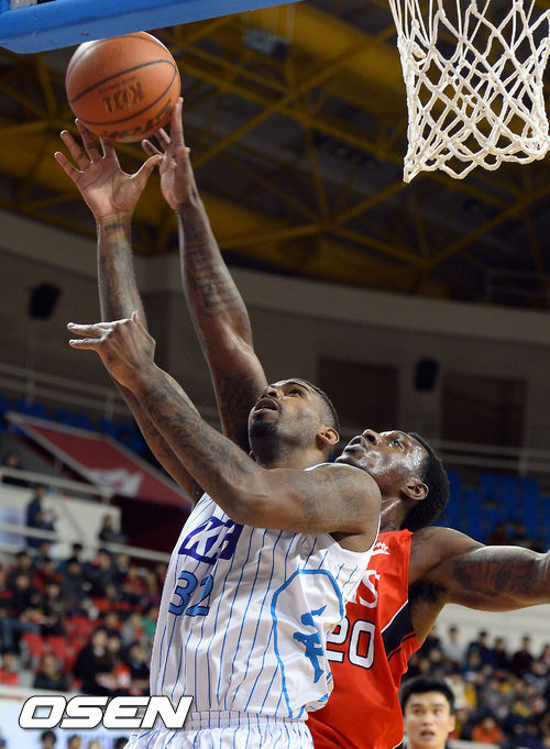 1쿼터, KCC 윌커슨의 골밑슛을 리틀리프가 블로킹 하고 있다.