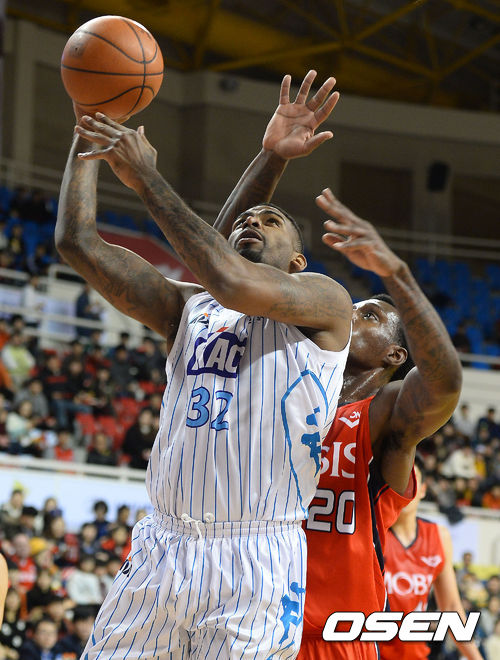 1쿼터, KCC 윌커슨이 모비스 라틀리프 수비를 뒤로한채 골밑슛을 시도하고 있다.