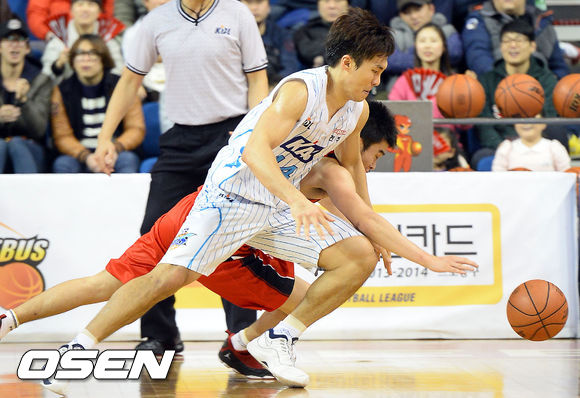 3쿼터, 모비스 이대성과 KCC 노승준이 루즈볼을 다투고 있다.