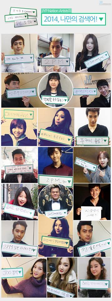 JYP 측은 2일 오후 공식 페이스북에 "'나만의 검색어'로 알아본 JYP네이션 아티스트들의 새해 소망, 2014년 새해 복 많이 받으세요!"라는 글과 함께 소속 아티스트들의 '나만의 검색어' 인증샷을 게재했다.