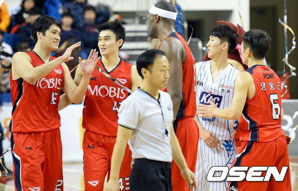 경기종료, 승리한 모비스 양동근과 함지훈이 KCC 김민구와 인사를 나누고 있다. /ouxou@osen.co.kr