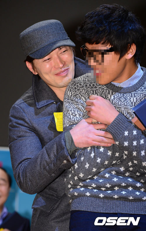2일 오후 서울 회기동 경희대학교 평화의전당에서 열린 영화 '플랜맨' 쇼케이스에서 정재영이 한 팬에게 포옹을 하고 있다.