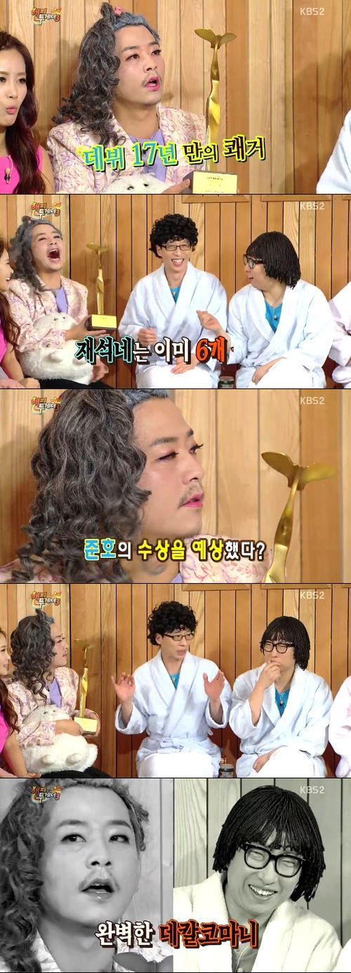 이후 김준호는 "긴장감을 들키고 싶지 않았는데 내가 뭐라고 했는지도 모르겠더라"고 수줍게 고백했지만, 박명수는 "받고 나서 되게 안 풀린다"라고 대상의 저주를 퍼부어 웃음을 자아냈다.