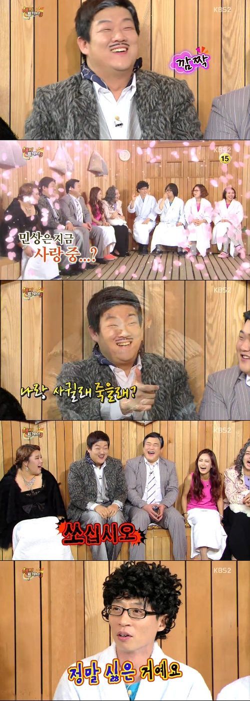 이에 유재석은 “희극인실에도 ‘파리의 연인’ 상속자들‘이 다 있다”라며 유민상이 짝사랑하는 상대 여성이 28기 개그맨임을 폭로했다.