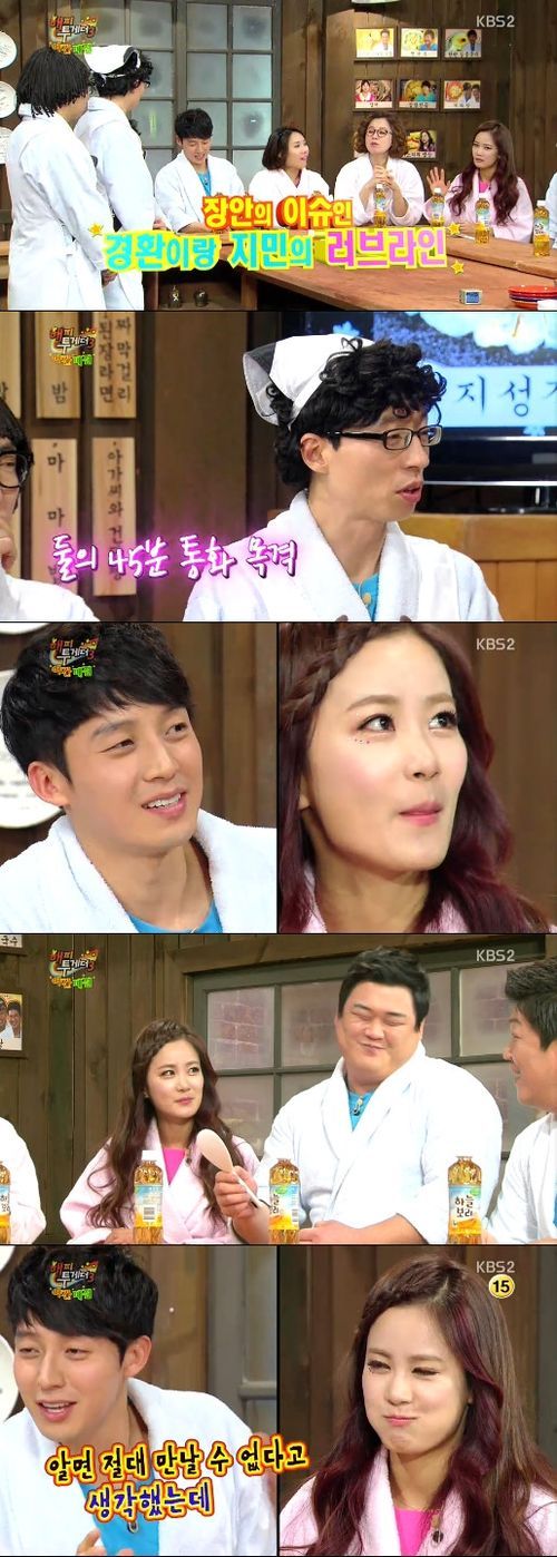 이날 유재석은 화제가 된 허경환과 김지민의 러브라인을 화두에 올렸다. 이에 김준현은 “둘이 전화와 문자도 주고받는다”라며 “‘인간의 조건 촬영 때 둘이 45분이상 길게 통화한 걸 목격한 적이 있다”라고 폭로해다.