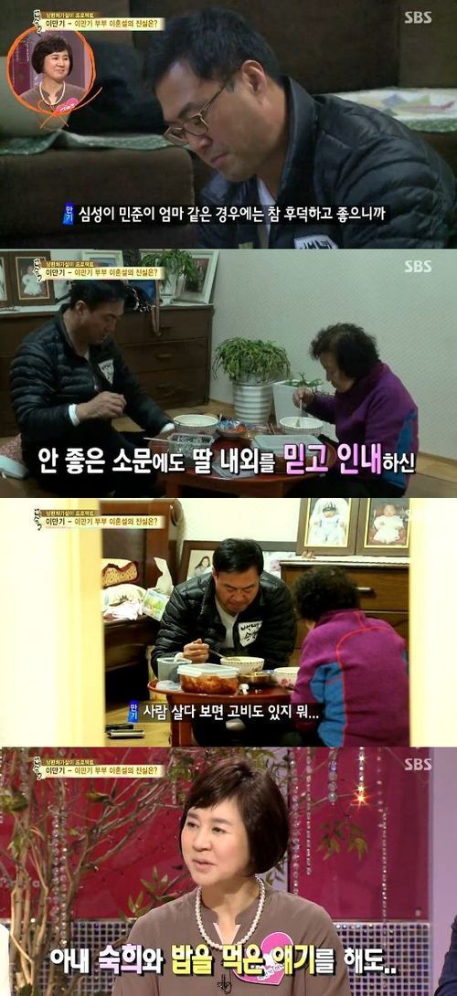 이날 방송에서 장모는 "(딸의) 아버지도 바람을 피웠다. 인물 있고 유명한 사람이니 안 그렇겠나 생각했다"며 넌지시 이혼설을 언급했다. 이어 장모는 "결혼 후에 사는 모습을 보고 안심했다"고 말했다. 이에 이만기도 "민준 엄마 같은 경우 심성이 좋다"며 아내와의 사이가 좋음을 돌려 표현했다.