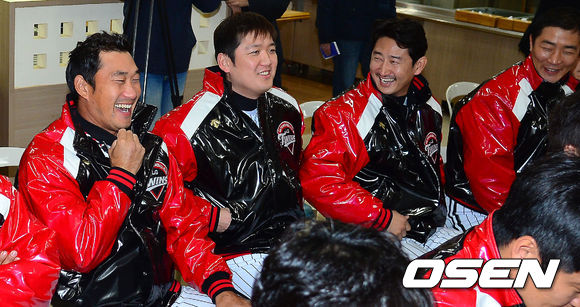 3일 오후 서울 잠실구장에서 열린 LG 트윈스 시무식에서 김선우가 봉중근, 박용택과 이야기를 나누고 있다.