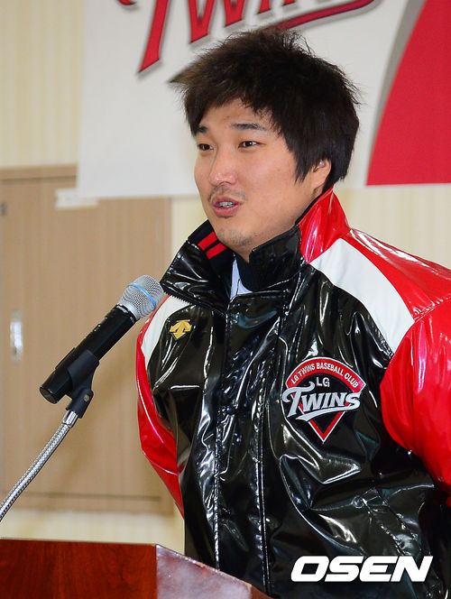 3일 오후 서울 잠실구장에서 열린 LG 트윈스 시무식에서 주장에 당선된 이진영이 인사를 하고 있다.