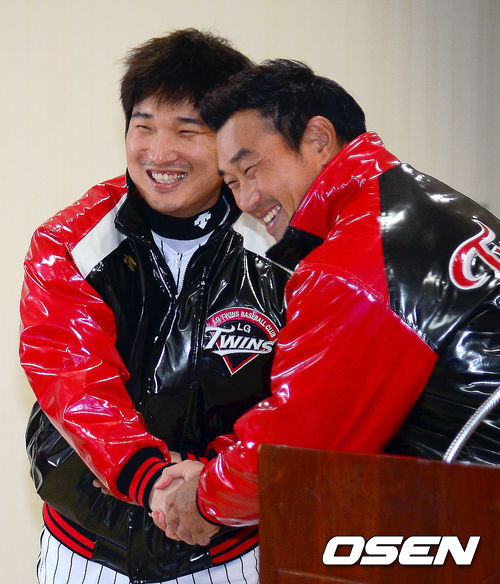 3일 오후 서울 잠실구장에서 열린 LG 트윈스 시무식에서 이진영과 봉중근이 악수를 하고 있다.