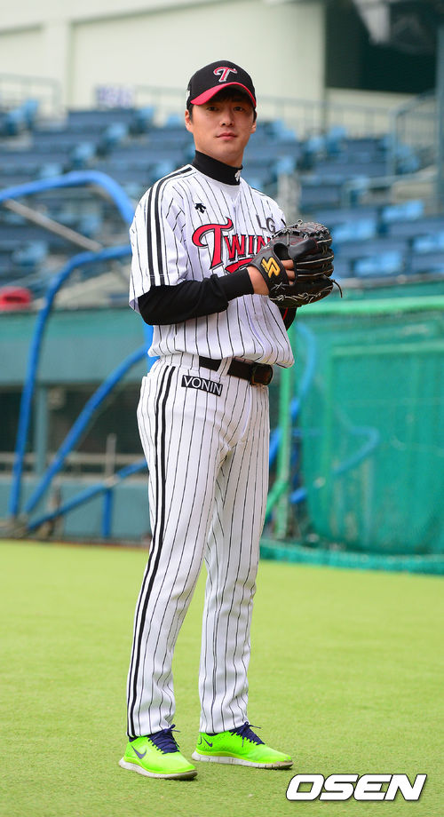 3일 오후 서울 잠실구장에서 열린 LG 트윈스 시무식에서 윤지웅이 포토타임을 갖고 있다.