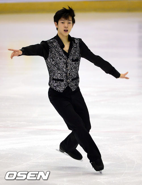 3일 오후 경기도 고양 어울림누리 얼음마루 빙상장에서 열린 제68회 전국남녀 피겨스케이팅 종합선수권대회(KB금융 코리아 피겨스케이팅 챔피언십 2014) 남자싱글 시니어부문에서 휘문고 김강찬이 연기를 펼치고 있다.