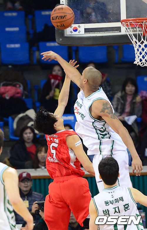 2쿼터 SK 김선형이 동부 모스의 슛블록에 당하고 있다.