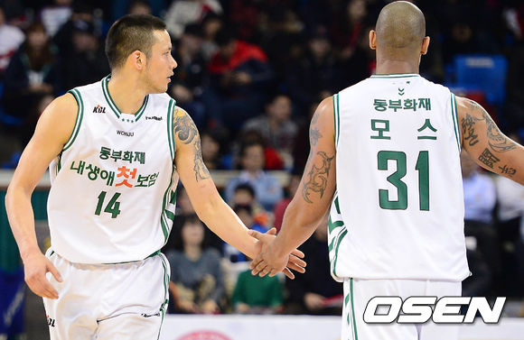 3쿼터 득점에 성공한 모스가 이승준과 하이파이브를 하고 있다.