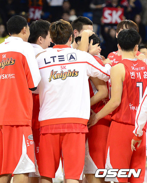 경기 종료 후 SK 김선형이 동료들과 승리의 기쁨을 나누고 있다./sunday@osen.co.kr
