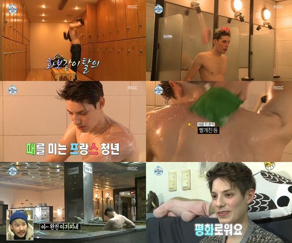 모델 겸 외국인 배우 파비앙이 때를 미는 한국형 목욕 문화를 즐기는 모습으로 눈길을 끌었다.