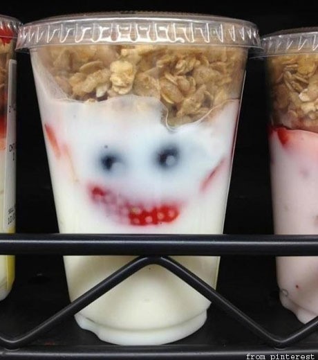 아침식사 대용으로 널리 사랑받는 시리얼+요거트+과일은 특히 미국에서 쉽게 찾아볼 수 있다. 평범한 아침식사로 판매되고 있는 요거트지만, 딸기와 블루베리가 절묘하게 자리잡으면서 마치 조커를 보는 듯한 착각을 일으키고 있다.