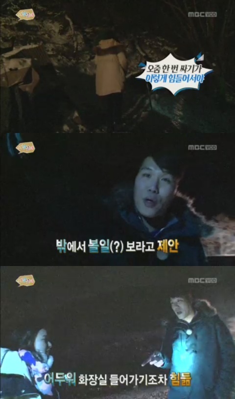 서장훈이 적당한 장소를 찾아 이하늬는 눈 쌓인 밭 뒤편에서 일을 해결할 수 있었다. 그러면서 이하늬는 “다시는 물마시나 봐라”라고 했다.