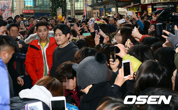 김성균과 손호준이 4일 오후 서울 명동 일대를 공약 이행차 방문, 팬들에게 둘러싸여 당황스러운 표정을 짓고 있다.