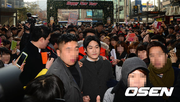 김성균이 4일 오후 서울 명동 일대를 공약 이행차 방문, 팬들에게 둘러싸여 당황스러운 표정을 짓고 있다.