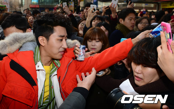 손호준이 4일 오후 서울 명동 일대를 공약 이행차 방문, 팬들에게 캔커피를 건내고 있다.