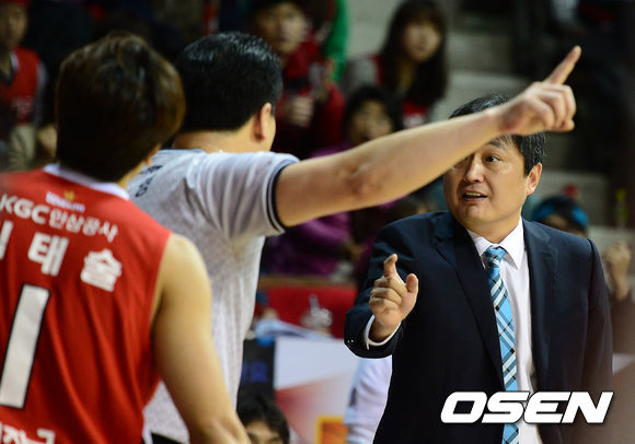 4일 오후 안양실내체육관에서 열린 'KB국민카드 2013-2014 프로농구' 안양KGC와 서울삼성의 경기, 1쿼터 KGC 이상범 감독이 심판 판정에 불만을 나타내고 있다.