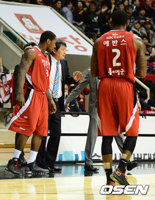 4일 오후 안양실내체육관에서 열린 'KB국민카드 2013-2014 프로농구' 안양KGC와 서울삼성의 경기, 2쿼터 KGC 이상범 감독이 맥키네스와 이야기를 나누고 있다.