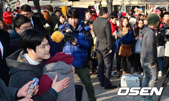 김성균이 4일 오후 서울 홍대 일대에서 공약 이행을 위해 나타나 팬들과 포옹을 하고 있다.