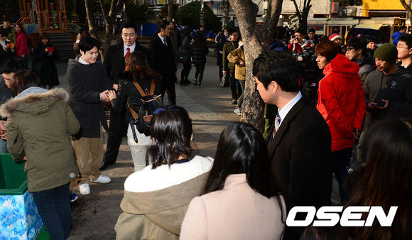 김성균이 4일 오후 서울 홍대 일대에서 공약 이행을 위해 나타나 팬들에게 캔커피를 전달하고 있다.