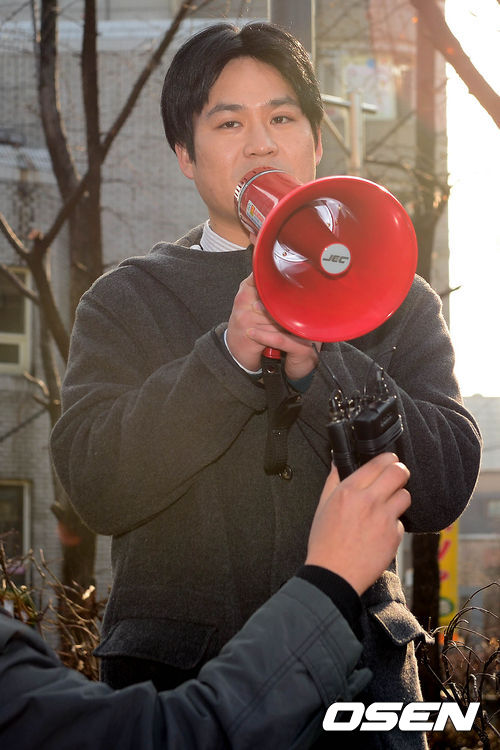 김성균이 4일 오후 서울 홍대 일대에서 공약 이행을 위해 나타나 팬들에게 인사말을 하고 있다.