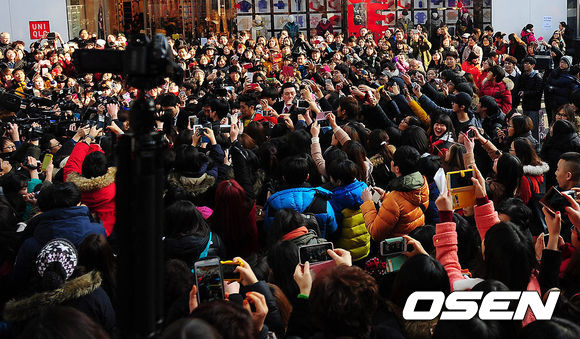 김성균과 손호준이 4일 오후 서울 명동 일대에서 공약 이행을 위해 방문한 가운데, 수많은 인파가 몰려있다.