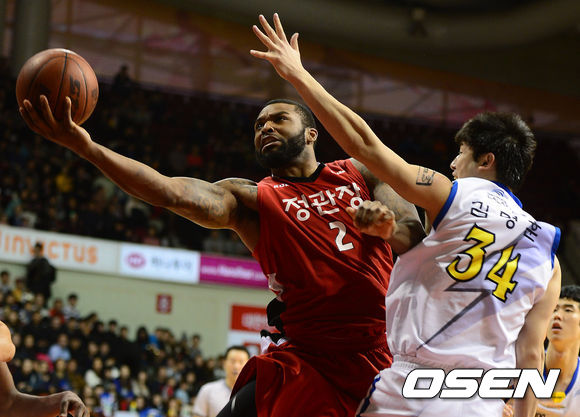 4일 오후 안양실내체육관에서 열린 'KB국민카드 2013-2014 프로농구' 안양KGC와 서울삼성의 경기, 3쿼터 KGC 에반스가 삼성 김명훈의 수비를 피해 레이업을 성공시키고 있다.