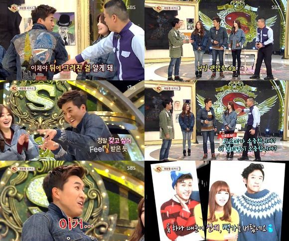 이날 방송에서 김종민은 '재봉틀 피카소' 정민기 씨의 옷을 입고 즉석 패션쇼를 선보였다. 그는 등 부분에 그림이 새겨진 청재킷을 입고 등장, 보는 이들의 시선을 집중시켰다.